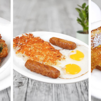 Shredded potatoes typically formed into patties and fried to a crispy golden brown.