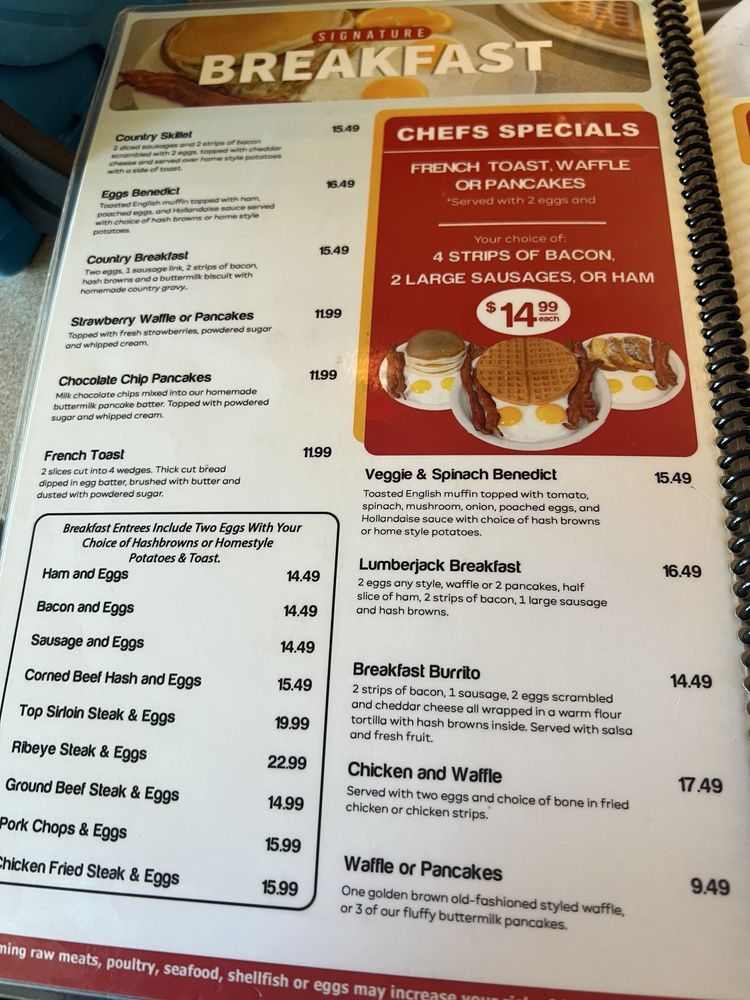 eggs any style, waffle or pancakes, half slice of ham, strips of bacon, large sausage, and hash browns.