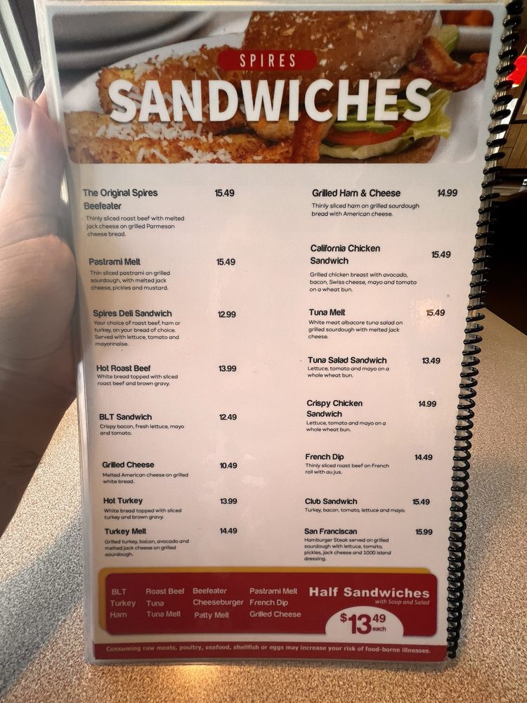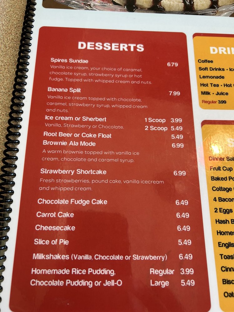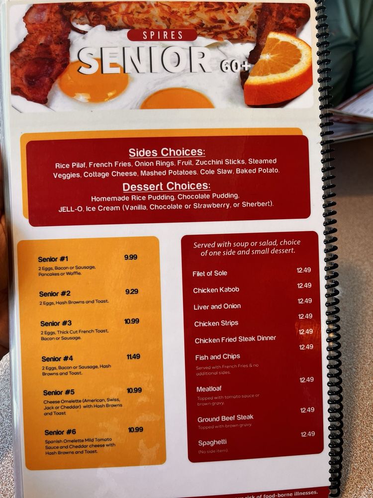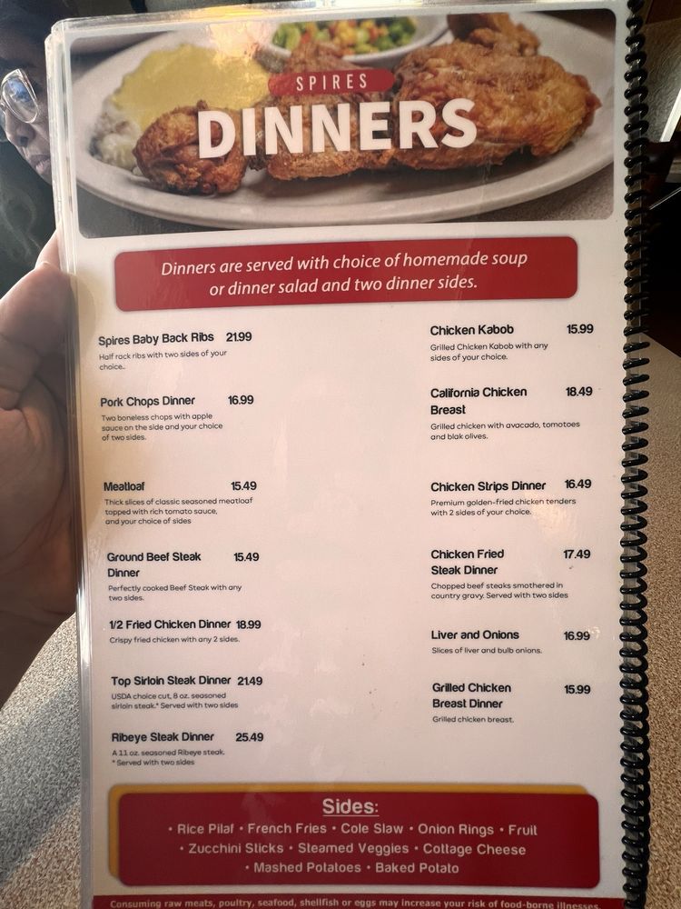 Spires Restaurant, located in Ontario, CA, is a versatile dining establishment offering American cuisine, desserts, breakfast, and brunch options. Known for its extensive menu and accommodating amenities, Spires Restaurant takes reservations, provides delivery and takeout services, and is wheelchair accessible. Accepting various payment methods, including Android Pay, Apple Pay, and credit cards, the restaurant also features outdoor seating, suitable for groups, kids, and pets. With a laid-back atmosphere and attentive waiter service, Spires Restaurant caters to a diverse clientele, offering meals for any time of day. The inclusion of private lot parking, free Wi-Fi, and gender-neutral restrooms adds to the inclusivity of the establishment. Additionally, the restaurant's eco-friendly practices, such as plastic-free packaging and reusable tableware, highlight its commitment to sustainability. Whether you're dining in or grabbing a quick meal to-go, Spires Restaurant provides a satisfying dining experience.